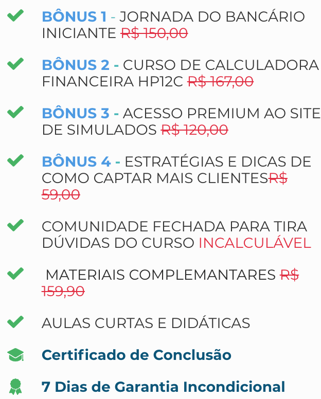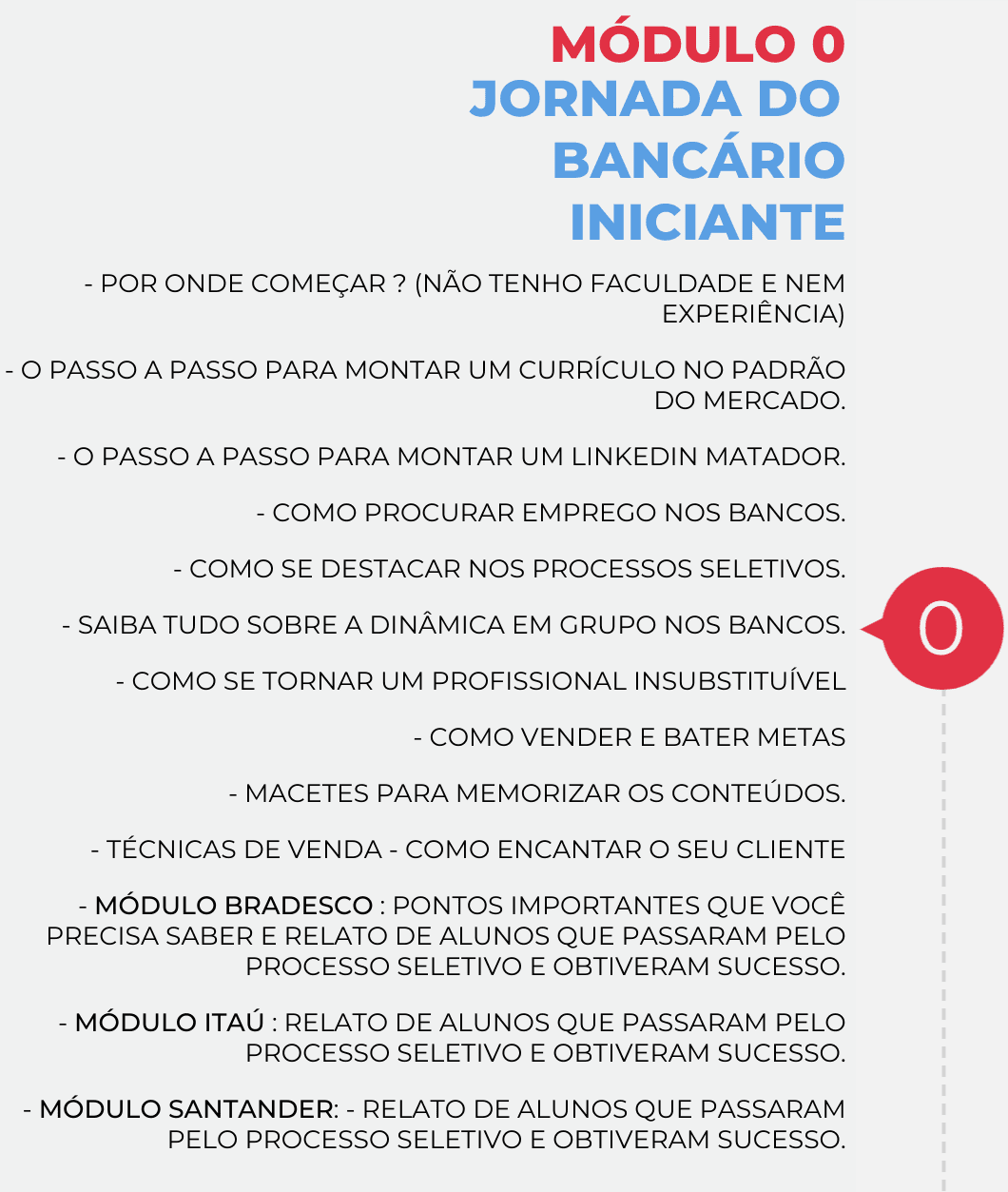 Isso como?? Nosso curso tem aulas exclusivas que te ensinam passo a passo como iniciar do ZERO sua carreira profissional no Banco.